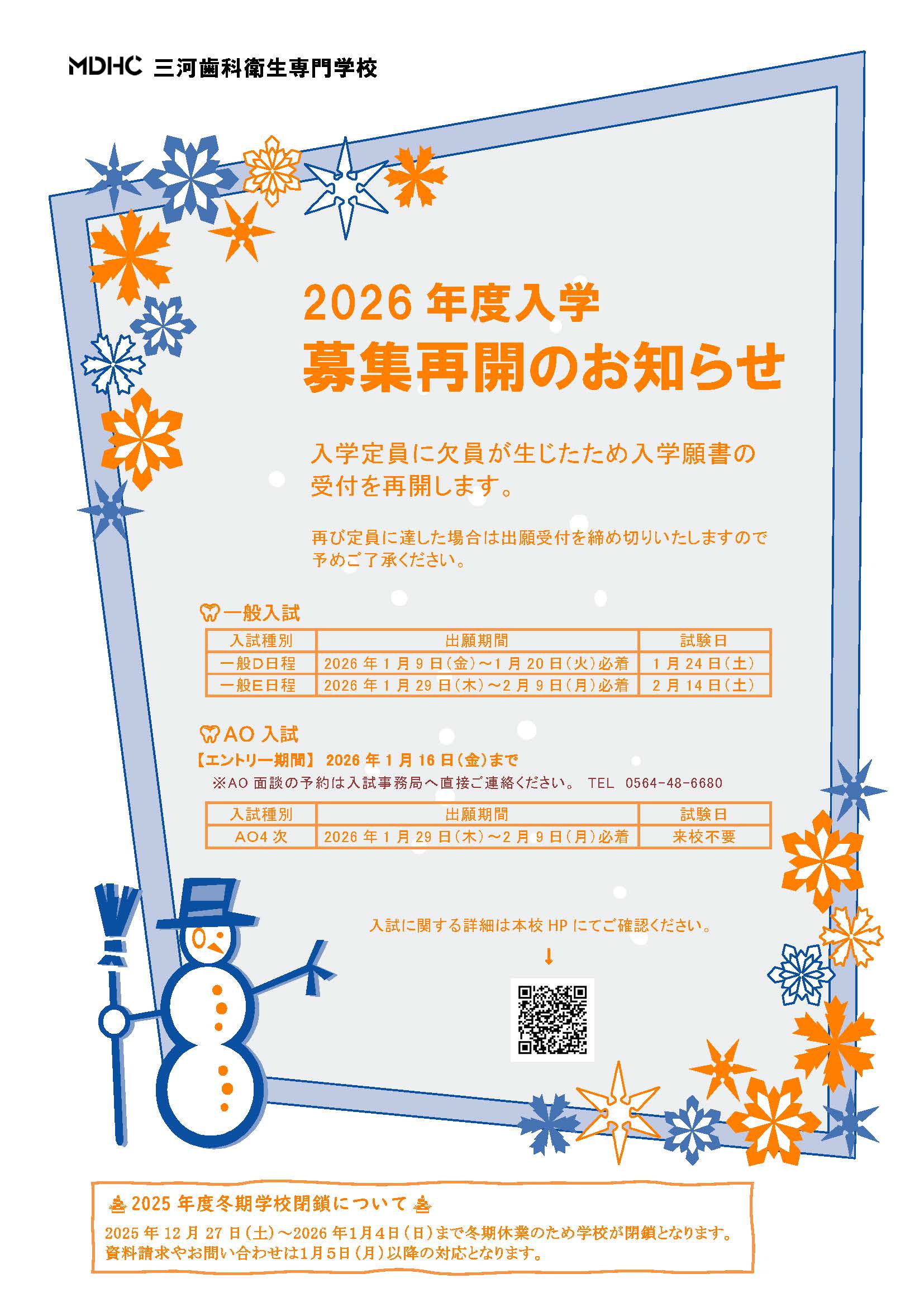 入学定員に欠員が生じたため入学願書の受付を再開いたします。